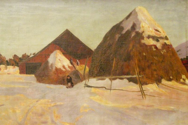 Vinterlandskap med höstack