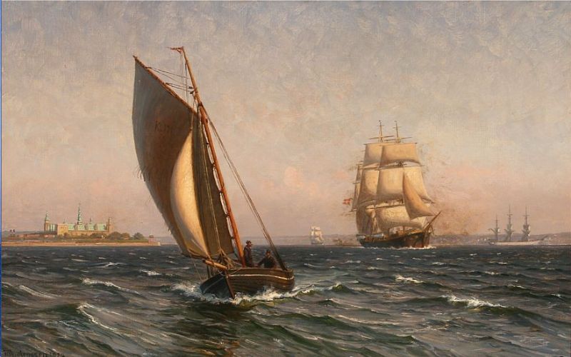 | Marine with smaller and larger sailing ships near Elsinore Castle | |