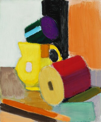 | Still life. Small yellow pitcher with green paper roll on top, red paper roll on a pink table surface. Green and pink background | |