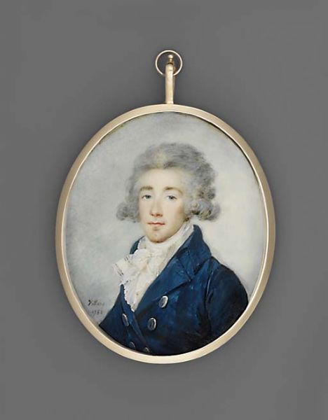 | A young gentleman, in blue coat with large silver buttons, striped white waistcoat and frilled cravat, powdered hair | |