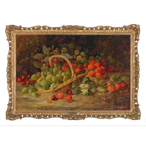 | GOOSEBERRIES, STRAWBERRIES, RASPBERRIES, CHERRIES AND GRAPES IN BASKETS ON A MOSSY BANK WITH IVY | |