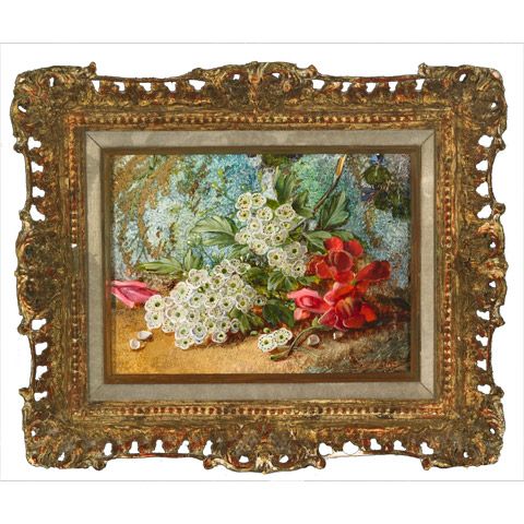 RED AND WHITE BLOSSOMS ON A MOSSY BANK