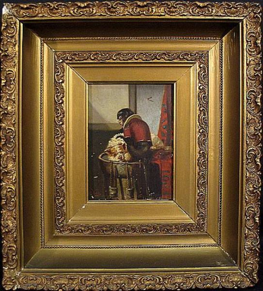 An interior scene with a monkey grooming a dog