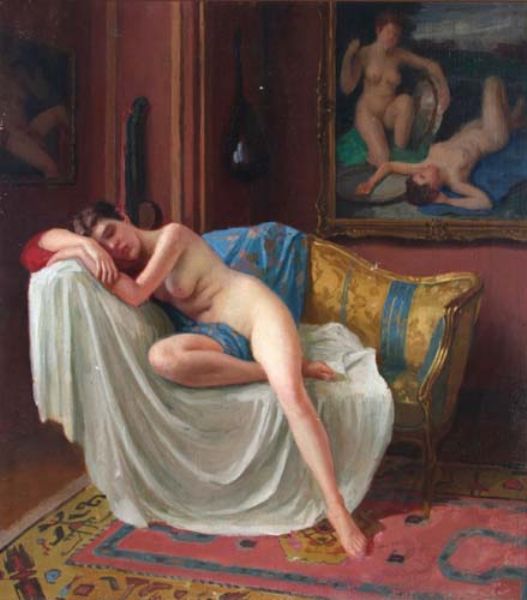 Weiblicher Akt im Boudoir, auf einem Sofa liegt eine schlafende junge Schöne