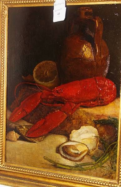 Still life of seafood and a stoneware jug on a step