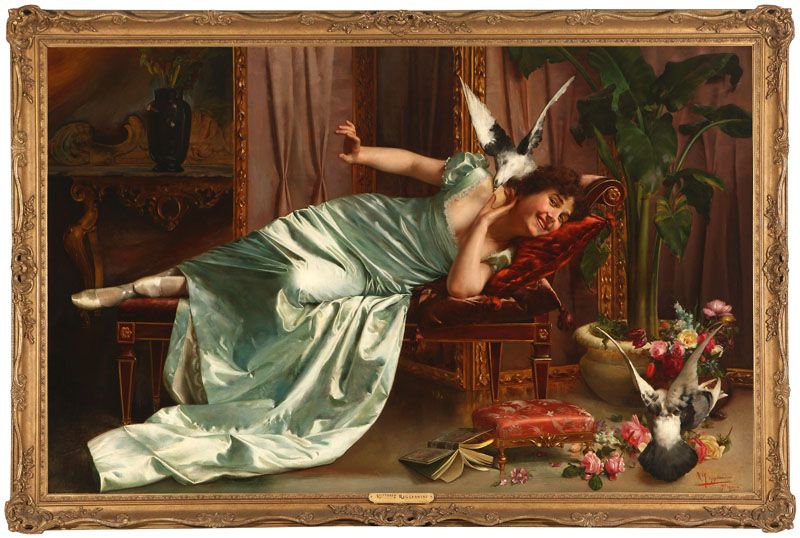 | Reclining Woman in a Mint Green Gown Frolicking with Doves in a Salon | |