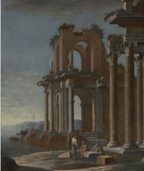 | CAPRICCIO WITH FIGURES BY A RUINED PAVILION ON A SHORE | |