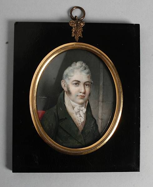 | A Gentleman, wearing green coat, cream waistcoat, frilled white chemise and tied white stock, seated in a red chair. | |
