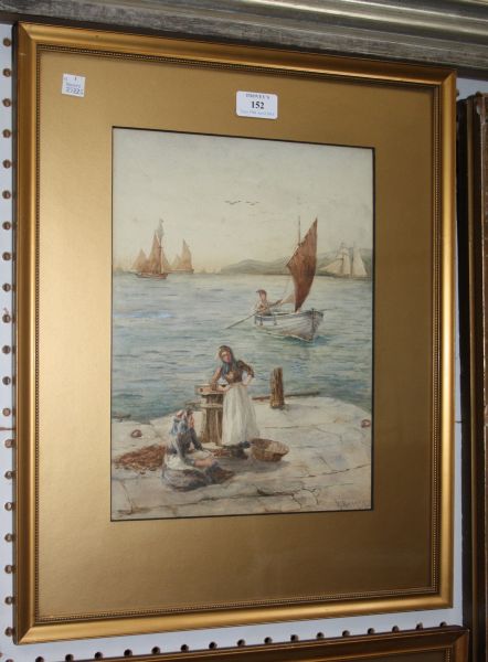 Coastal Views with Figures on Harbour Walls, Sailing Vessels beyond