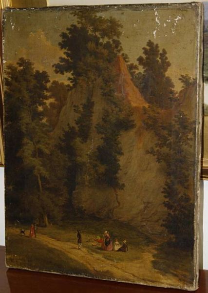 Figures picnicking before a rock face