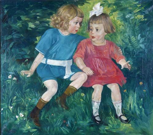 Kinderbild, Knabe und kleines Mädchen in einem Wiesenstück sitzend
