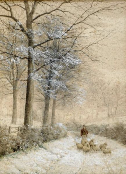 a wintry morning with shepherd droving his flock to the foreground