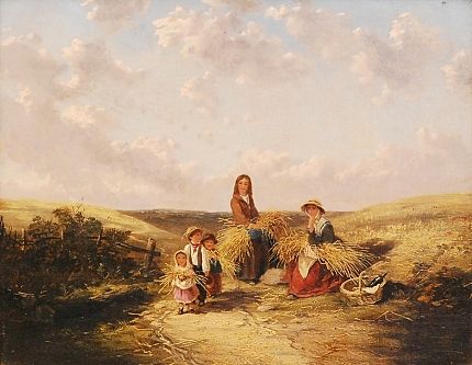 hay gatherers showing two women and three children carrying hay in a sparse countryside
