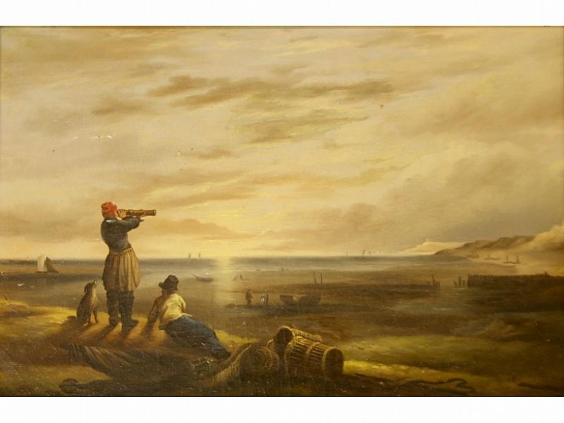 | study of two fishermen and a dog looking out at sea through a telescope | |