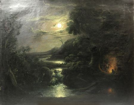 A RIVER LANDSCAPE BY MOONLIGHT, WITH FIGURES GATHERED ROUND A FIRE