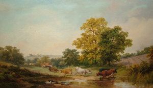 Cattle and ducks by a stream with cottages and woodland in the distance