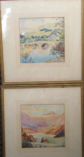 depicting river landscape with arched bridge and lake scene with mountains in background