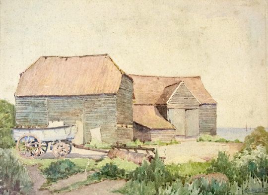 Barns with cart and roller in foreground