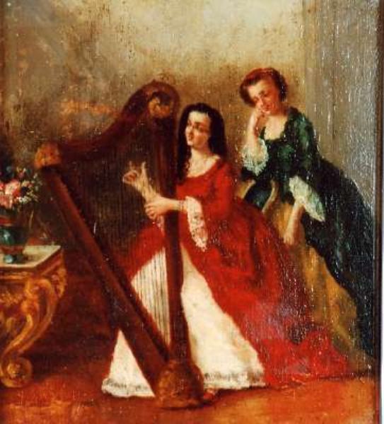 Interieuer mit zwei Damen, eine beim Harfenspiel