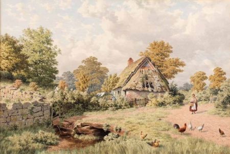 Figure and Chickens in a Country Lane with further Figure and Cottage beyond