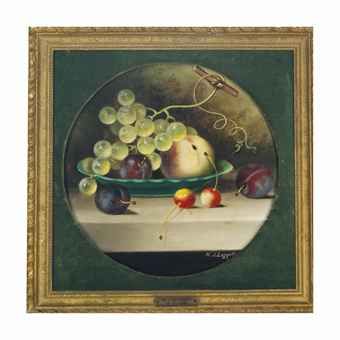 | Green grapes, cherries, peaches and plums in a green bowl; and Black grapes, peaches and plums on a stone ledge | |