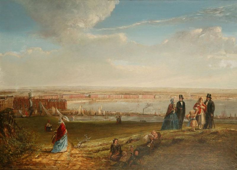 | A view of Weymouth Bay from the high ground to the west of the harbour with numerous figures in the foreground | |