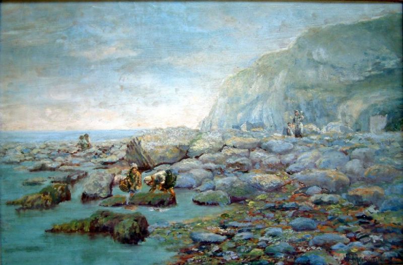 Children rock pooling beneath cliffs