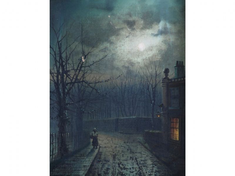 Moonlit street scene with female figure