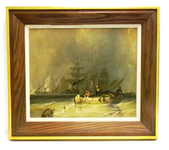 seascape depicting fishermen in foreground adjusting netting and tackle