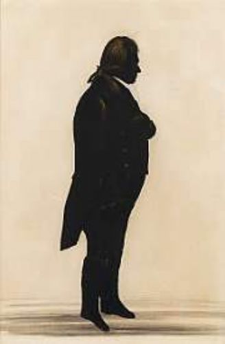 | A silhouette of a Gentleman, standing full-length, profile to the right, wearing frock coat, breeches and boots, a pair of spect | |