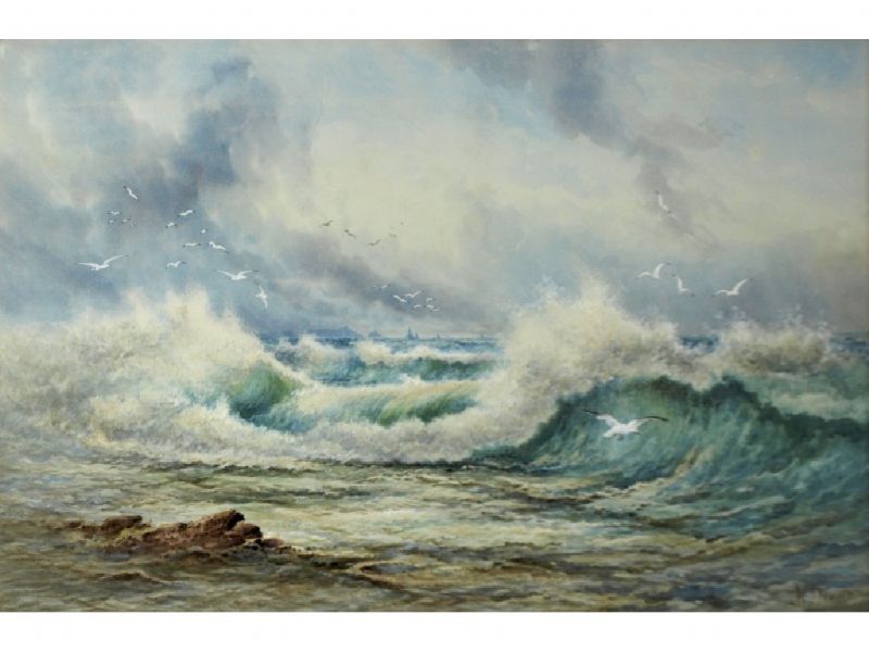 Breaking wave, gulls in the foreground, view across a bay to shipping beyond