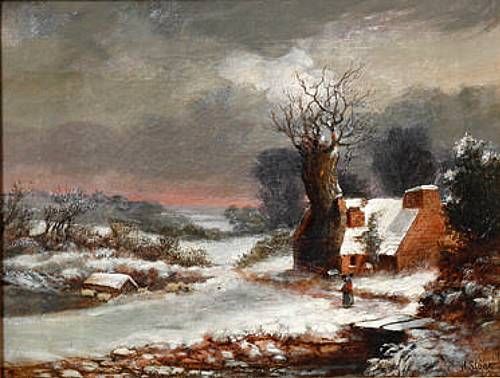 Winter landscape at sunset with a figure standing beside a cottage in the foreground