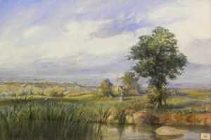 Figure in a river landscape with a cottage and hills in the distance