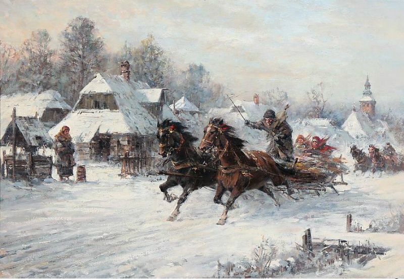 Troika ride in a village, winter