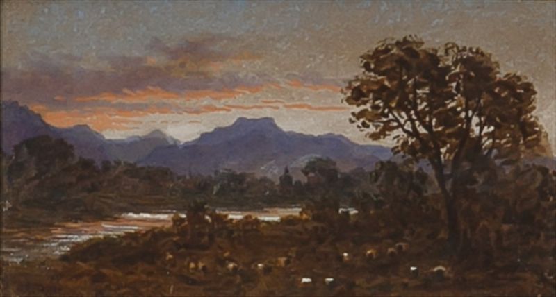 A RIVER LANDSCAPE AT SUNSET