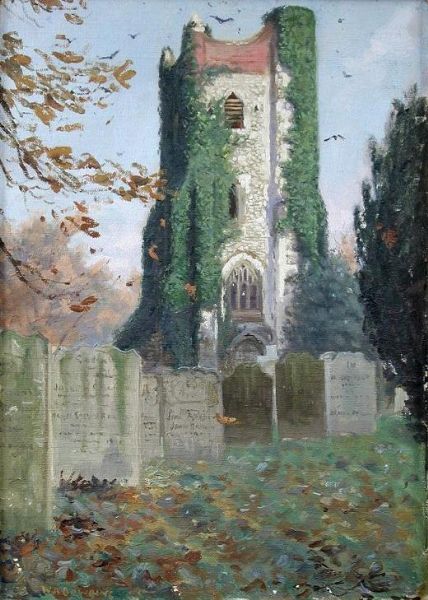 Study of an Ivy-Covered Church Tower beside a Churchyard