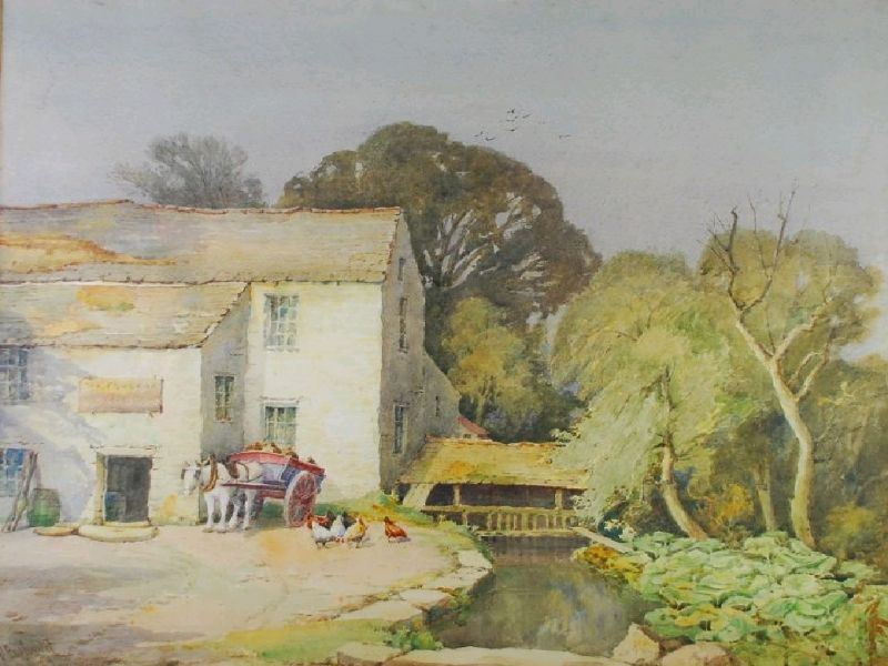 Water mill with mill stream, horse drawn wagon waiting with poultry in the yard