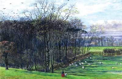 Mother and child near a copse with sheep grazing