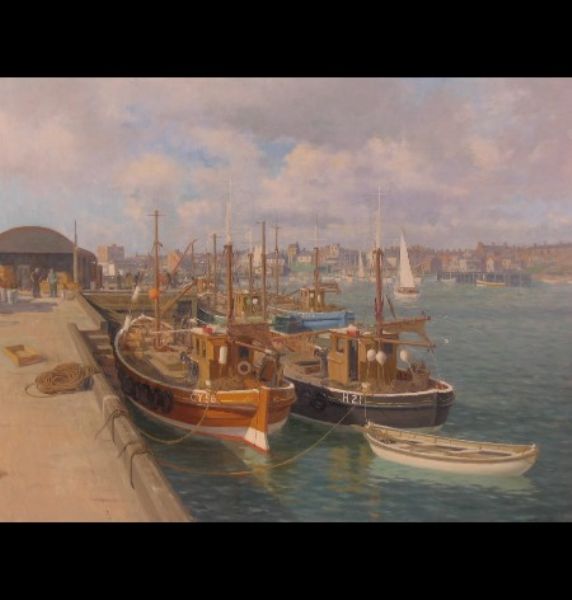 Fishing boats by the quayside, Bridlington Harbour, with figures in the distance