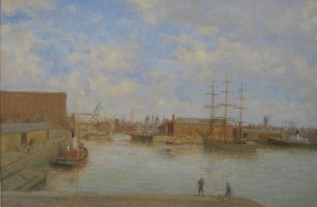| Princess Dock, Hull, with figures in the foreground, the city skyline in the background | |