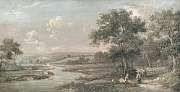 | Figures by a river with cattle watering, an extensive pastoral landscape beyond | |