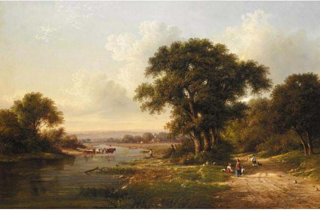 FIGURES ON A PATH IN A WOODED RIVER LANDSCAPE