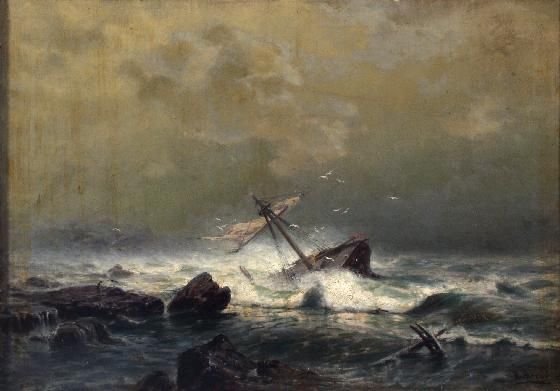 Schiffbruch - an Klippen gestrandetes Schiff bei bewegter See