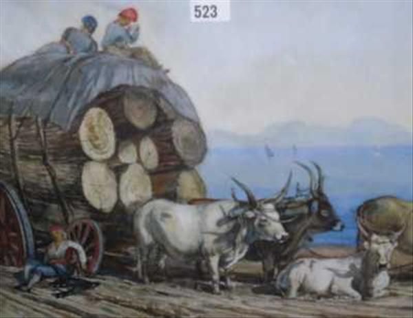 Oxen and log cart with a broken wheel