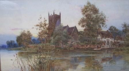 | River landscape with the Crown Inn and the church on the river bank with figures fishing | |