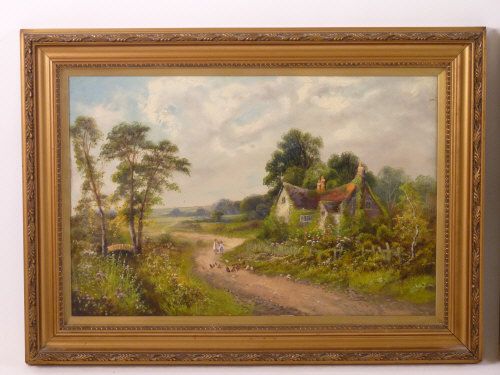 FIGURES ON COUNTRY LANES WITH THATCHED COTTAGES A pair