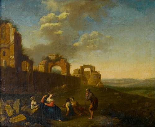 An extensive landscape with figures resting before ruins