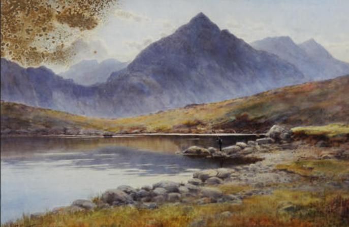 | A mountainous lake landscape in Snowdonia, with sheep grazing, and another similar with figure at the lakeside, a pair | |