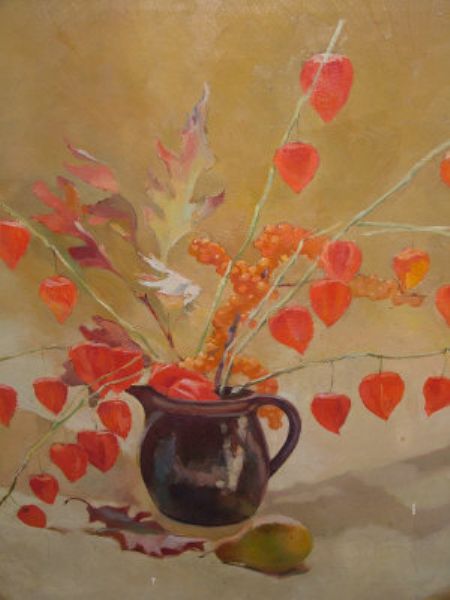 | Still life of Chinese Lanterns in a jug with a pear | |