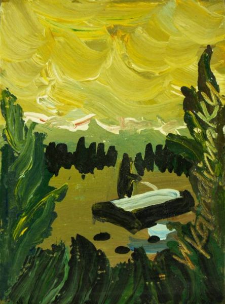 Bewaldete Gebirgslandschaft mit Holzbrunnen.